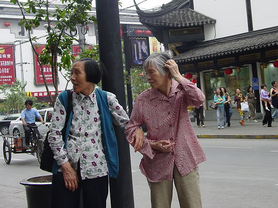 Two ladies, hand in hand strolling in Yuyuan and observing all.